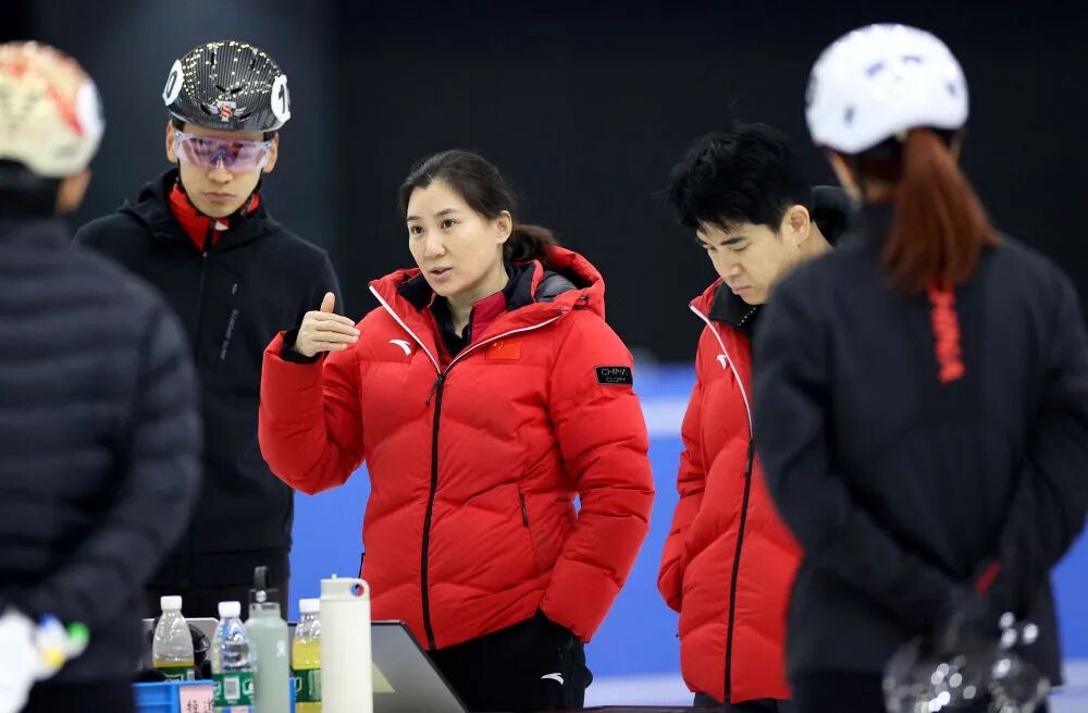 1月29日,中國短道速滑隊教練張晶(中)布置訓練任務。新華社記者 張晨 攝