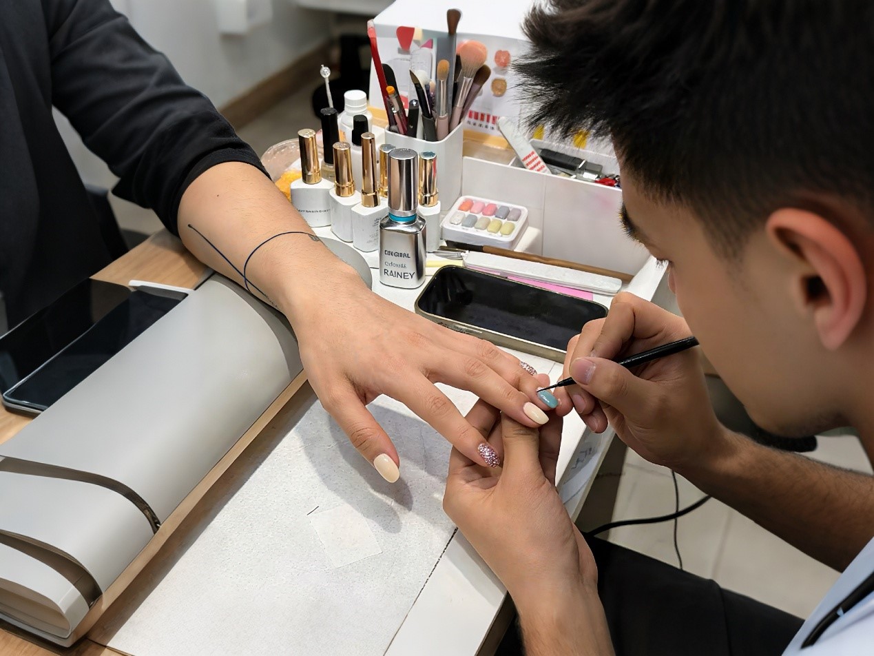 ▲男員工試色新款甲油膠產品。Zoe丨攝
