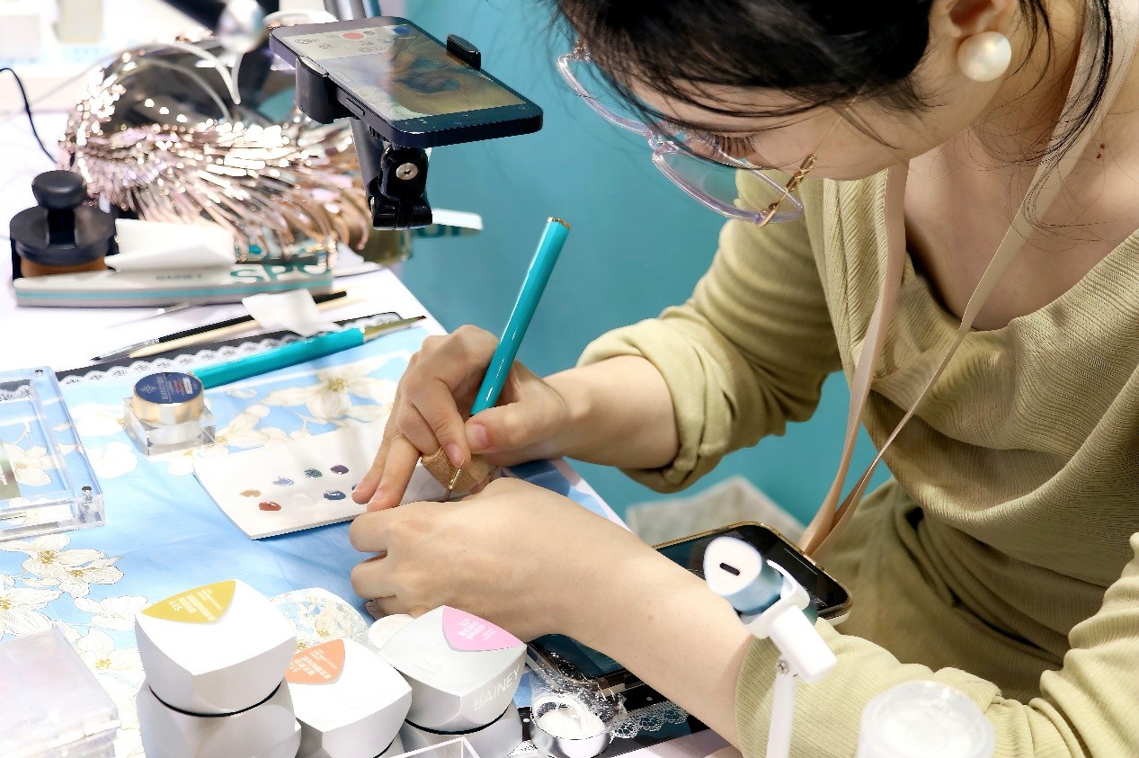 ▲員工錄制甲油膠彩繪演示視頻。Zoe丨攝