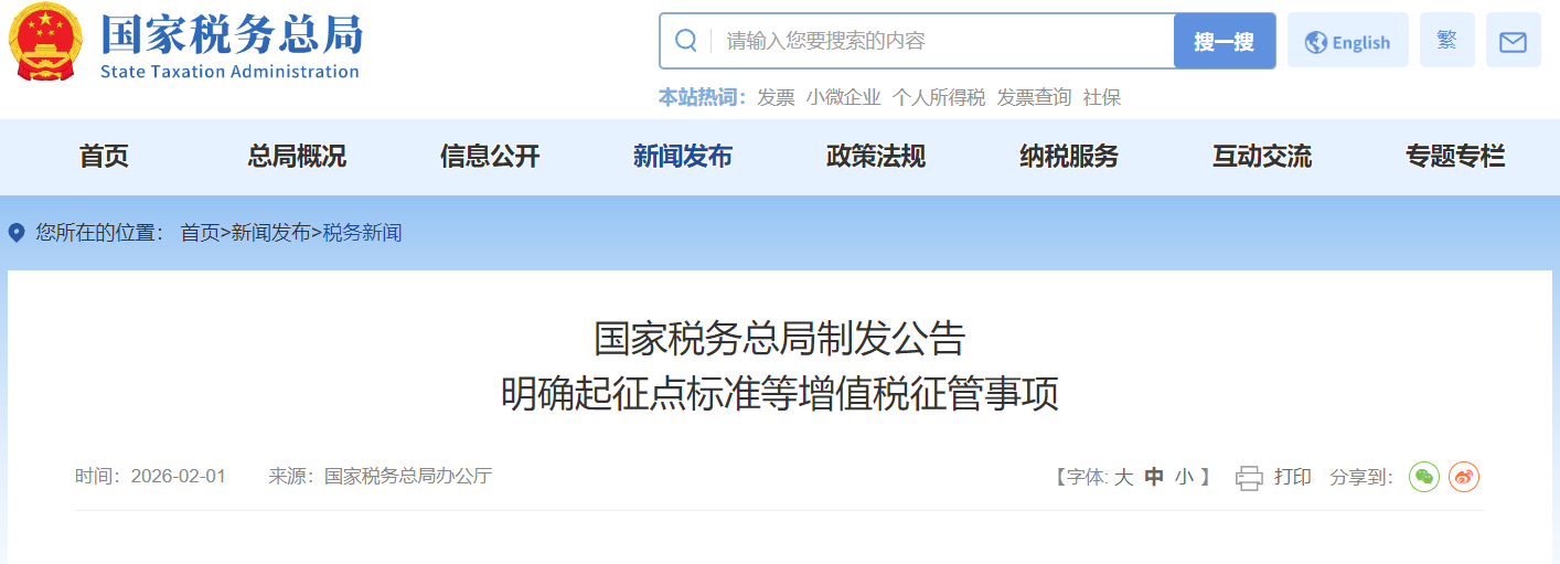 2026年1月1日起,《中華人民共和國增值稅法》及其實施條例正式施行。