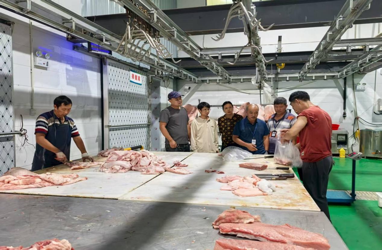 工作人員在屠宰場(chǎng)對(duì)豬肉開展抽樣