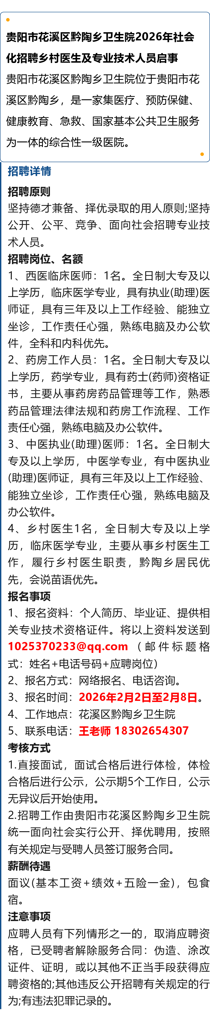 貴陽市花溪區黔陶鄉衛生院招聘!報名截止時間:2月8日!