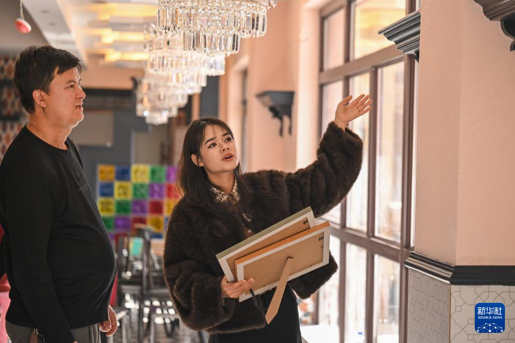 在新疆墨玉縣普恰克其鎮(zhèn),穆耶賽爾·艾合麥提托合提(右)為一家即將開業(yè)的桑皮紙主題餐廳設(shè)計桑皮紙元素軟裝。新華社記者 丁磊 攝