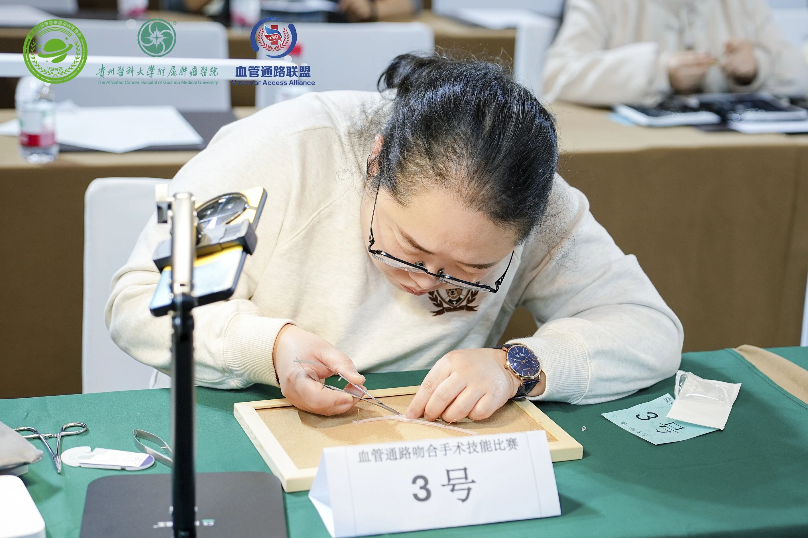 表彰結束后,血管通路聯盟首屆“血管通路吻合手術技能競賽”在眾人的熱切期盼中啟動,作為本次聯盟總結會的一大亮點,比賽共吸引了20名參賽選手同臺競技;經過激烈角逐,來自黔東南州中醫醫院吳曉明醫師獲得本次比賽一等獎,白云區人民醫院鄒登波醫師、貴州醫科大學第二附屬醫院彭文水醫師2人獲得二等獎,貴州中醫藥大學第一附屬醫院唐媛媛醫師、首鋼水鋼醫院陳艷紅醫師、平壩區人民醫院劉小玲醫師3人獲得三等獎,黔西南州人民醫院張發鑫醫師、印江縣人民醫院李明鳳醫師、綏陽縣人民醫院樊雪梅醫師、余慶縣人民醫院艾玉琴醫師、德江縣人民醫院雷雨陽醫師、遵義市播州區人民醫院喻邦能醫師、畢節市一醫鄢靜雯醫師、思南縣人民醫院朱順芳醫師、銅仁市婦幼保健院鐘昌琴醫師、貴陽市公共衛生救治中心吳紅維醫師、貴航貴陽醫院龍薪羽醫師、遵義市播州區人民醫院何鑫醫師、黔西南州中醫醫院徐文祥醫師、遵義德銘腎病醫院付洪瑜醫師共14人獲得優秀獎。