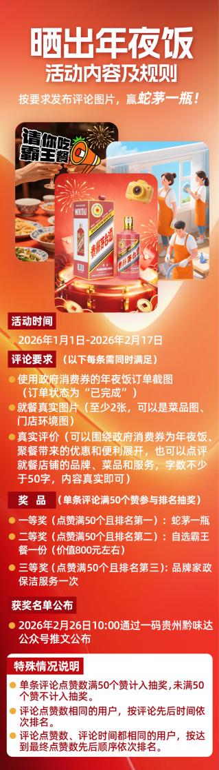 活動期間,消費者參與“曬出年夜飯”活動,只需簡單三步:第一步上傳使用政府消費券的年夜飯訂單截圖(訂單狀態(tài)需為“已完成”);第二步分享就餐實景圖至少2張(可為菜品、餐廳環(huán)境等);第三步撰寫50字以上真實點評,內(nèi)容可圍繞消費券優(yōu)惠、用餐體驗、菜品服務(wù)等展開。單條評論滿50個贊參與排名抽獎,消費者可邀請好友點贊,即有機會登上點贊排行榜,贏取豐厚獎品:第一名獲茅臺生肖“蛇茅”酒一瓶,第二名獲自選價值800元霸王餐一份,第三名獲品牌家政保潔服務(wù)一次(更多活動細則可上一碼貴州查看)活動持續(xù)至2月17日,中獎名單將于2026年2月26日10:00通過“一碼貴州黔味達”公眾號推文公布。
