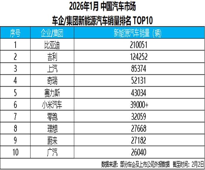 新年伊始,中國新能源汽車市場的競爭輪廓迅速顯現,頭部車企之間的差距在1月銷量榜單中被進一步拉開。截至2月2日,根據部分車企及上市公司對外披露的數據,比亞迪以超21萬輛的新能源汽車銷量位居行業首位,展現出極具強大的市場競爭力,繼續穩居中國新能源市場頭部位置,并在主要車企中拉開明顯差距。