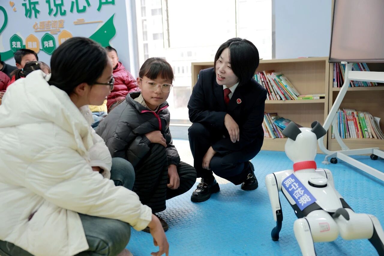 科技感十足的普法機(jī)器狗一亮相,立刻成為全場(chǎng)焦點(diǎn)。孩子們圍成一圈,興奮地看著它靈活走動(dòng)、播放普法語(yǔ)音,在充滿趣味的互動(dòng)中吸收法律知識(shí)。