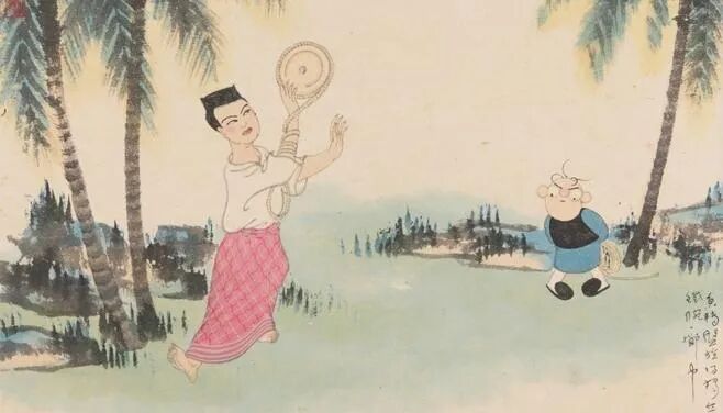 貴州山區邊遠地方,多為苗族群眾居住,每到社日,在貴陽街頭,就見到苗族男女青年來趕集,他們多半是用馬馱著木柴、土產什么的進城來出賣;婦女多半是背著竹筐,裝些山貨沿街叫賣,她們穿著繡花的土藍布衣裙,打著裹腿,光腳穿著草鞋;男青年大多包著白色大頭巾,如果遇到他們的節日,男女老少都會盛裝打扮在噴水池邊集合,熱鬧非凡。我常擠在人群里畫速寫,聽他們唱山歌,山歌大多是情歌,曲調高亢、淳厚、粗獷,蘊含著率真的強烈感情。歌詞中形象的比喻,奇特的想象,通過自然嗓音的表達,生動自然十分感人,我常想如果用樸實的民間剪紙或版畫形式來畫山歌一定很協調。那是戰爭年代,沒有這份閑情去畫,但他一直在我的心里孕育著,一直到一九四七年,時局因打內戰緊張起來,那時我已復員回到南京,漫畫不好畫了,我便想起畫‘苗家情歌’。我畫得很順手,沒有框框,沒有拘束,似乎是即興的、隨意的流露出來的。