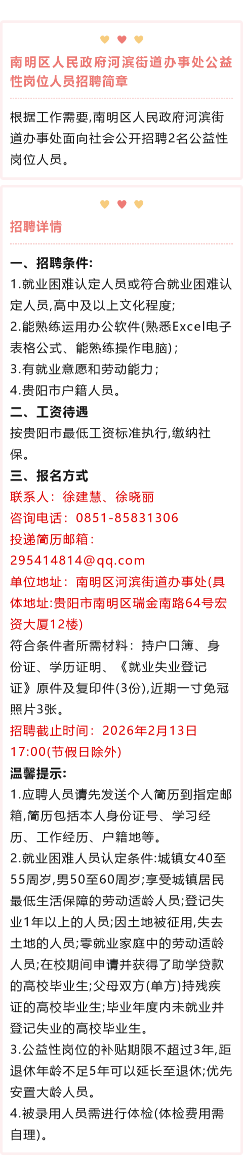 【政府機關】貴陽市南明區人民政府河濱街道辦事處招聘!高中起報!