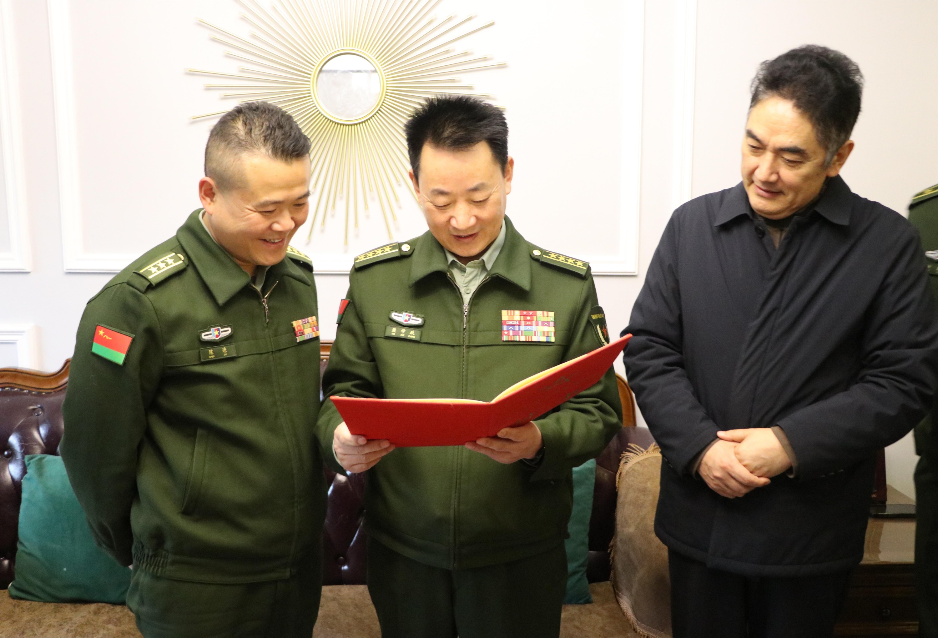 慰問組一行與陳進家屬親切交談,親手將燙金的三等功喜報遞到家屬手中,向他們致以熱烈的祝賀和崇高的敬意,詳細轉達了陳進在部隊的優異表現,感謝家屬們默默堅守、無私奉獻。家屬手捧喜報,臉上滿是自豪與喜悅,激動地表示,這份榮譽是部隊對陳進的肯定,更是家庭的榮光,今后將繼續全力支持陳進在部隊的工作,鼓勵他不忘初心、牢記使命,珍惜榮譽、再接再厲,在軍營中再立新功、再創佳績。