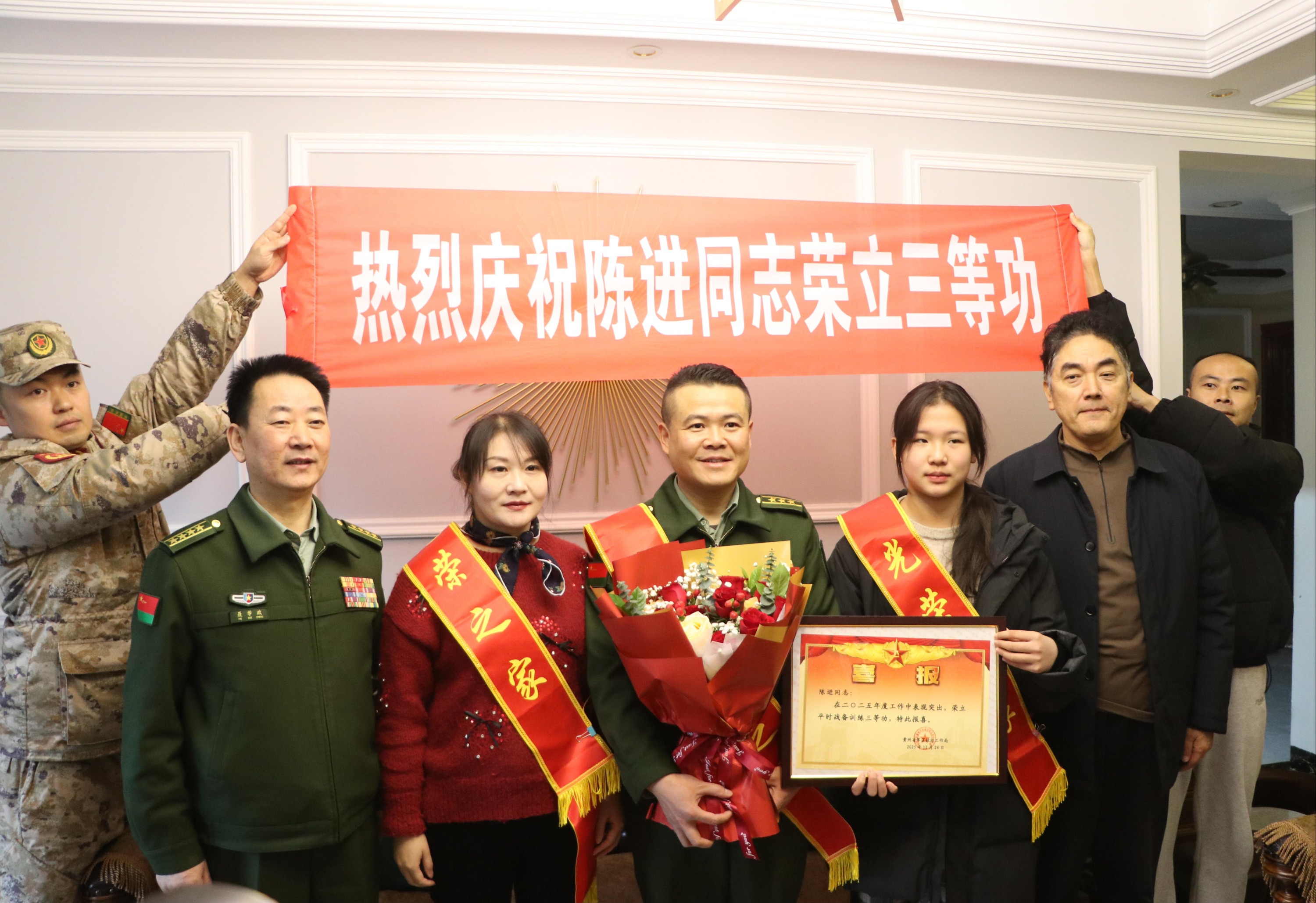 一人立功,全家光榮。2月3日上午,貴陽市南明區退役軍人事務局聯合南明區人民武裝部相關領導組成送喜報慰問組,專程前往世紀南山小區,為榮立三等功的現役軍人陳進家屬送上立功喜報,把關懷與尊崇送到軍屬身邊,讓軍功榮譽照亮家門。