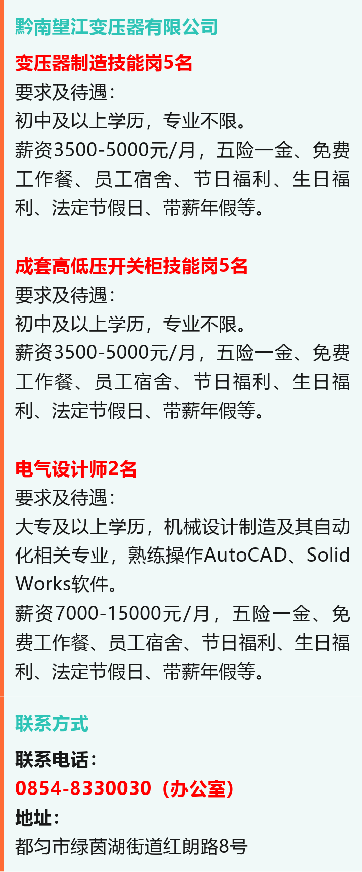 招聘變壓器制造技能崗、成套高低壓開關柜技能崗等崗位!月薪可達15000元!五險一金、免費工作餐、員工宿舍!